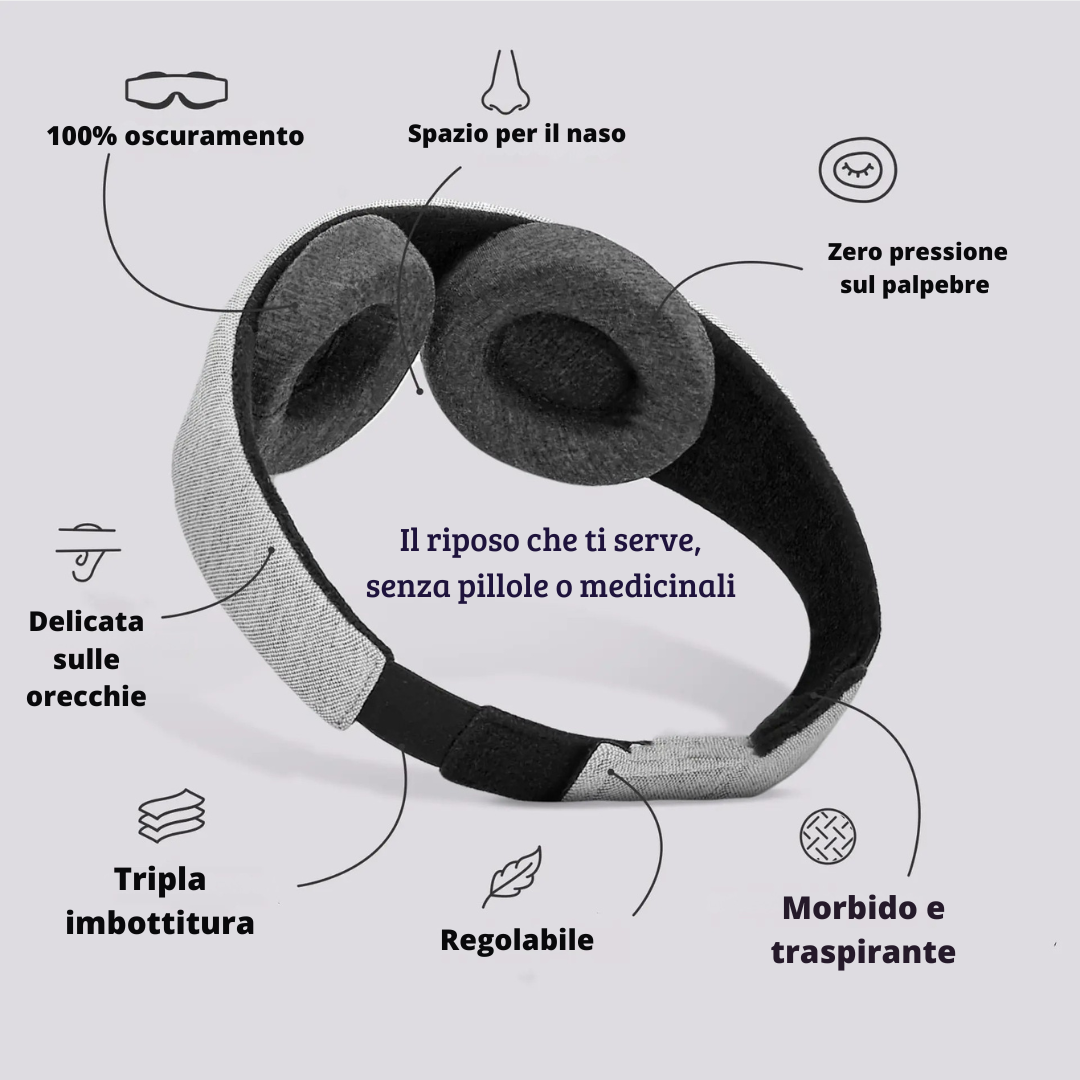 La nostra maschera per dormire è progettata per eliminare ogni fonte di luce, creando un ambiente ideale per un riposo profondo e rigenerante. Il suo design ergonomico riduce la pressione sugli occhi, mentre il tessuto morbido e traspirante coccola la pelle per ore di sonno confortevole. È perfetta per chi soffre di risvegli notturni, jet lag o semplicemente vuole migliorare la qualità delle proprie notti.