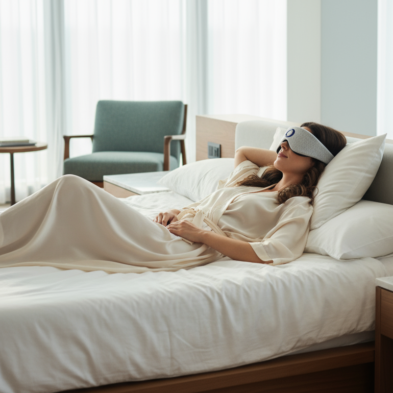 I suoi pad oculari, realizzati in morbido tessuto Modal, si adattano perfettamente al viso senza esercitare pressione sugli occhi — pensata per offrire il massimo comfort.